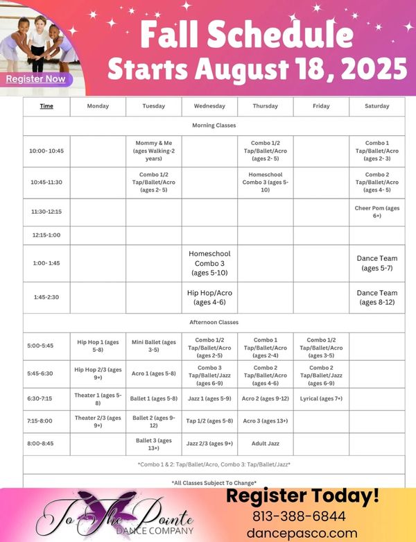 Registration for our 2025-2026 Dance Season is NOW OPEN! We offer a wide variety of class options throughout the week to fit your busy schedule! Space is limited so register today!