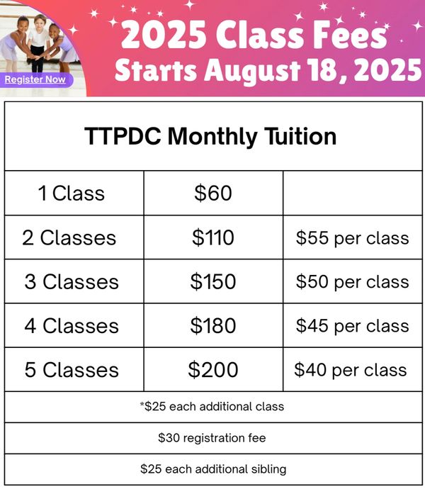 Registration for our 2025-2026 Dance Season is NOW OPEN! Our classes are once a week and start at $60 monthly.